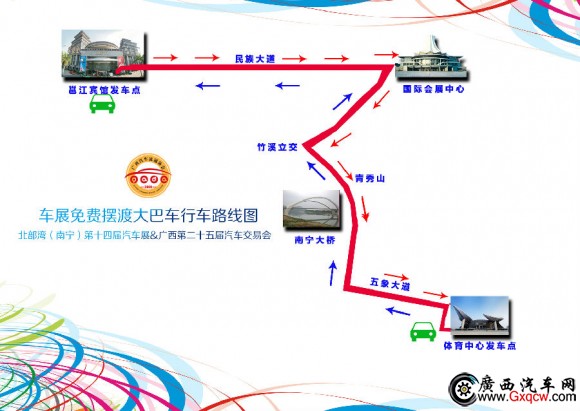 本次車展特為廣大客戶設置了免費大巴接送,從市中心的邕江賓館出發(fā),每半個小時發(fā)一趟車!免費大巴時間:9:30-16:30。具體路線見下圖: