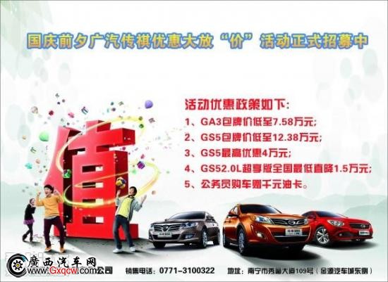 9月27日,廣汽傳祺南寧迅利店將舉行“國慶前夕 優(yōu)惠大放‘價(jià)’活動(dòng)”,活動(dòng)優(yōu)惠政策如下: