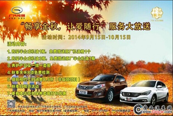 廣汽傳祺南寧迅利店《暢享金秋,讓愛隨行》活動正式啟動,為您“疲勞”的愛車送上最溫暖呵護(hù)。