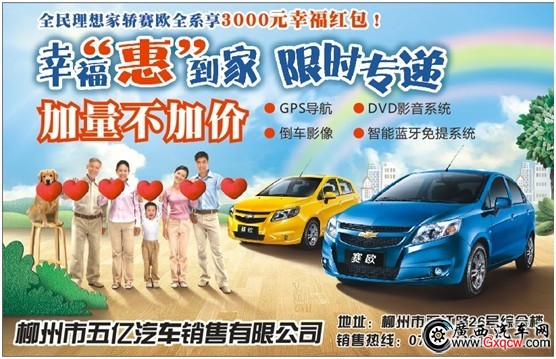 作為首款探入5萬元區(qū)間的國際品牌車型,雪佛蘭新賽歐憑借國際品質(zhì)、大空間、高安全、低油耗贏得了消費(fèi)者,尤其是首次購車的城市普通家庭的關(guān)注。近日,新賽歐現(xiàn)正開展“幸;莸郊,加配不加價(jià)”的活動,年底前凡購買雪佛蘭新賽歐任何一款車型,消費(fèi)者即可享受價(jià)值3000元的配置禮包,感興趣的朋友不妨到柳州五億雪佛蘭了解更多詳情,或撥打銷售熱線:3161866咨詢。