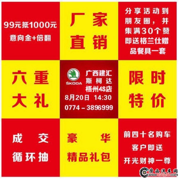 作為歷史最悠久的品牌之一,在這121年以來我們一貫注重對每個客戶的人性化關愛。如今斯柯達大力支持中國運動團隊,在奧運會場一展風采,而我們要將更好的產品帶至千家萬戶,并攜手各區(qū)域優(yōu)秀經銷商共同創(chuàng)造卓越的品牌體驗!上汽大眾斯柯達廠家聯(lián)合大西南區(qū)南寧建匯店、南寧上源店、南寧昊道店、北海分店、百色分店、防城港分店、欽州分店、貴港分店、梧州分店九店同時啟動九店同時啟動特別舉辦“8.20奪金風暴 一惠到底 上汽大眾斯柯達九店聯(lián)動 萬人團購會 廣西站 ”。鉅惠空前,****!總部車型資源庫實時匹配,全部車型廠家定價直銷,限時3小時!廠家領導現場公布!