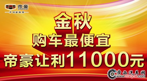 在過完了國慶長假后,很多想購車的朋友已經(jīng)提到自己的愛車。而還有一些在國慶忙碌中抽不出時(shí)間的朋友們,現(xiàn)在鵬帆帝豪將給您帶來好消息。本周末10月27~28日將在鵬帆帝豪4S店內(nèi)舉辦"金秋購車帝豪鉅惠讓利"活動(dòng),活動(dòng)期間購帝豪車的朋友講獲得萬元的鉅惠優(yōu)惠讓利。這次的活動(dòng)優(yōu)惠幅度大大的超過了以往的車展優(yōu)惠政策,如此高的讓利您還能不心動(dòng)嘛。