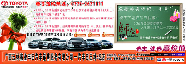 尊師重教是中華民族的傳統(tǒng)美德,在這樣一個(gè)向教師集體表達(dá)禮贊與祝福的日子,廣西玉林駿業(yè)豐田汽車(chē)銷(xiāo)售服務(wù)有限公司謹(jǐn)獻(xiàn)上最真誠(chéng)的祝愿,并為教師節(jié)獻(xiàn)上最真摯的三重禮活動(dòng)!