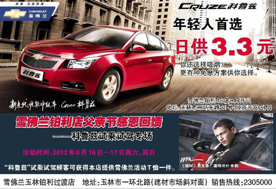 2012廣西首屆國際汽車文化節(jié)6月15-18日在國際會展中心拉開大幕,雪佛蘭廠家為確保各經(jīng)銷商銷量,限全區(qū)實現(xiàn)統(tǒng)一政策銷售。省去你長途跋涉的時間、精力和金錢。并為你以后的用車提供了便捷的售后保障。雪佛蘭玉林鉑利店特為推出科魯茲試乘試駕專場及賽歐、愛唯歐、邁銳寶、科帕奇等特價車型。更多驚喜等您到店!詳情歡迎來電咨詢,熱線:2305000,13877535319(小梁),