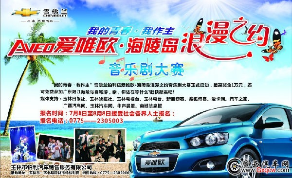 雪佛蘭鉑利店,音樂劇大賽“我的青春 我作主”愛唯歐•海凌島浪漫之約活動盛情開啟。活動集音樂劇大賽和車主自駕游等精彩節(jié)目于一體,*高獎金1萬元,還可免費參加廣東陽江海陵島自駕游,精彩不容錯過!活動正在火熱報名中,報名時間:7月8日至8月8日。報名方式:從活動微博http://aveo800.i.sohu.com/上下載表格,發(fā)送郵件到y(tǒng)lxfl800@163.com(注明團隊名稱、參賽題目、聯(lián)系方式、表演相關人員)