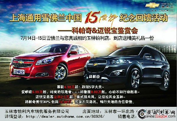 上海通用雪佛蘭中國(guó)15周年紀(jì)念回饋活動(dòng),車源不多,售完即止,歡迎廣大準(zhǔn)車主來(lái)店/電咨詢