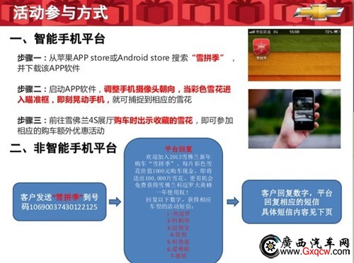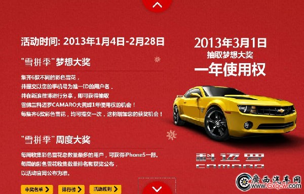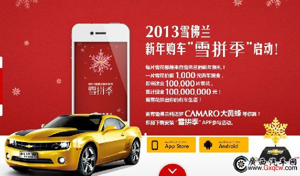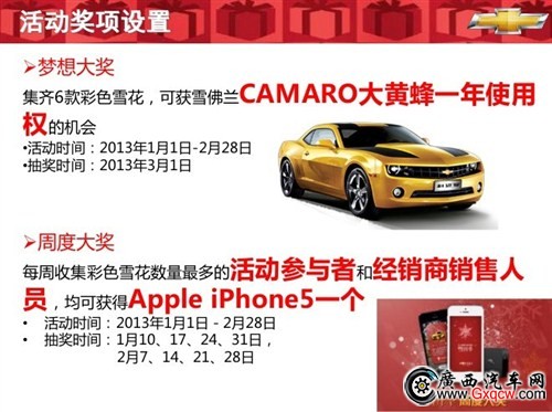 1月12日雪佛蘭鉑利4S店正式啟動雪佛蘭廠家新年購車億元“雪拼季”,只要您玩手機(jī)“雪拼季”游戲,您將有機(jī)會是Iphone5、大黃蜂科邁羅的主人。詢2305000,詳情登錄活動官方網(wǎng):http://www.chevrolet.com.cn/act/chevyisnow/