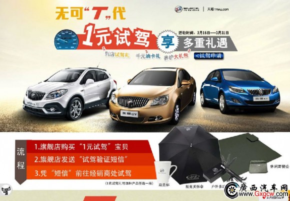 為更好的讓客戶體驗別克全系車型,別克全國經(jīng)銷商與天貓合作,在別克天貓旗艦店開展“1元試駕”活動,只要您在別克天貓旗艦店購買“1元試駕寶貝”即可尊享別克全系車型試駕體驗外,還可獲得由別克天貓旗艦店送出的禮品(休閑野餐墊、多功能戶外組合工具、別克關懷傘、馬克杯等四選一)不要猶豫啦,上網(wǎng)打開別克天貓旗艦店手指點一點即可參與。