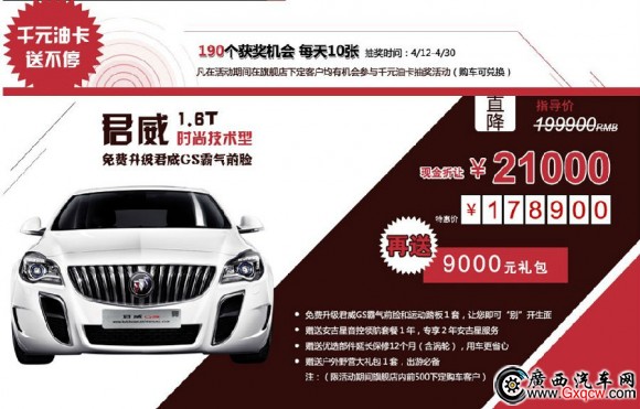 4月來臨,別克天貓再次登場,為您展開一場“別開生面”的特別購車行動。別克君威1.6T時尚技術(shù)型免費升級霸氣前臉,讓您的愛車即可“別”開生面。