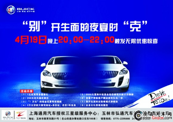 4月19日晚上20:00-22:00,2014年度的別克夜宴隆重登場,為您展開一場“別開生面”的特別購車行動,店內(nèi)英朗GT現(xiàn)車銷售,顏色可選,觸發(fā)無限的優(yōu)惠驚喜,優(yōu)惠幅度絕對比以下報價還要更往下探!