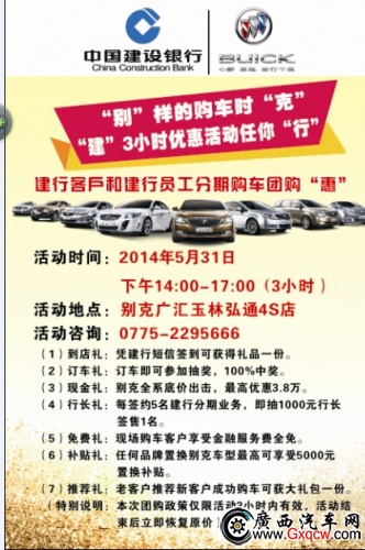 別克廣匯玉林弘通4S店為建設(shè)銀行玉林分行的戰(zhàn)略合作伙伴,一直以來有著良好的合作。針對建設(shè)銀行客戶和員工購車需求,別克廣匯玉林弘通4S店與建設(shè)銀行玉林分行將于2014年5月31日下午14:00-17:00將開展合作活動——建行客戶和員工分期購別克團購“惠”。此次活動,別克廣匯玉林弘通4S特別報批總部申請了一批“建設(shè)銀行客戶和員工優(yōu)惠購車活動”專屬優(yōu)惠政策的特惠車,僅限活動當(dāng)天3小時,無論是購買別克汽車還是辦理建行分期購車都有特別的政策優(yōu)惠,機不可失失不再來,詳詢別克廣匯玉林弘通4S店0775-2295666
