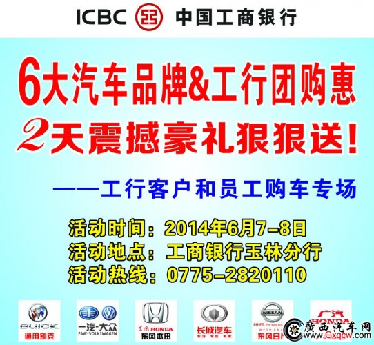 6月7-8日,廣匯廣西機(jī)電玉林片區(qū)的通用別克、長(zhǎng)城汽車、東風(fēng)本田、一汽大眾、東風(fēng)日產(chǎn)和廣汽本田等6大汽車品牌將聯(lián)合工商銀行玉林分行舉辦大型團(tuán)購(gòu)會(huì),屆時(shí)將為工行客戶和工行員工獻(xiàn)上一場(chǎng)分期購(gòu)車的優(yōu)惠盛宴。詳詢工商銀行玉林分行卡部:0775-2820110。