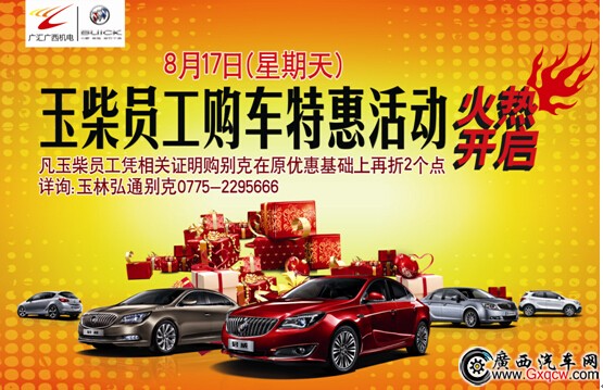 2014年8月17日(星期天),凡玉柴員工到別克廣匯玉林弘通4S店購買別克全系任意車型可享受集團專屬折扣,在原來超低優(yōu)惠的基礎上還可再折2個點,當天提車還可有千元大禮包贈送。詳詢別克廣匯玉林弘通4S店0775-2295666。
