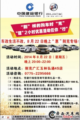 公務(wù)員車改怎么辦?外出辦事不方便怎么辦?為響應(yīng)車改政策,方便公務(wù)員購(gòu)車用車,玉林弘通別克4S店在本周末8月22日晚上20:00聯(lián)合中國(guó)建設(shè)銀行玉林分行舉行“公務(wù)員購(gòu)車特惠專場(chǎng)”。屆時(shí),活動(dòng)現(xiàn)場(chǎng)將針對(duì)公務(wù)員推出超值優(yōu)惠活動(dòng),并且公務(wù)員憑工作證明還可在原優(yōu)惠的基礎(chǔ)上再少1000元。