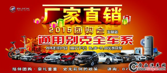2015年1月17日15:00-17:00,玉林弘通別克廠家直銷史上最強團購會,2014農(nóng)歷年*后一波鉅惠2015新歷年**波鉅惠,團購火爆招募中!*低價格、最全車型、優(yōu)惠等著你!活動結束后不再享受此次通用別克廠家特惠價格。詳詢玉林弘通0775-2295666