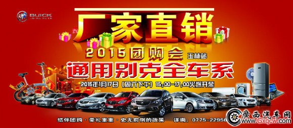 2015年1月17日15:00-17:00,玉林弘通別克廠家直銷史上最強團購會,2014農(nóng)歷年*后一波鉅惠2015新歷年**波鉅惠,團購火爆招募中!*低價格、最全車型、優(yōu)惠等著你!活動結(jié)束后不再享受此次通用別克廠家特惠價格。詳詢玉林弘通0775-2295666。
