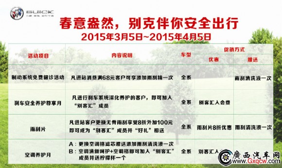 羊年春天的腳步已經(jīng)走近,不少車主朋友又到了駕駛愛車出行踏青的時候。萬物復(fù)蘇少不了綿綿春雨的滋潤,冬季后的愛車也需要一次精心的養(yǎng)護。為此玉林弘通別克4S店傾情為廣大車主朋友開展“春意盎然,別克伴你安全出行”的主題活動,為廣大車主春季踏青出行及雨天行車提供安心的養(yǎng)護。詳情請洽玉林弘通別克4S店售后服務(wù)部0775-2293663