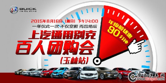 2015年8月16日(周日)下午14:00上汽通用別克2015年百人團(tuán)購(gòu)會(huì)(玉林站)正式招募啦!