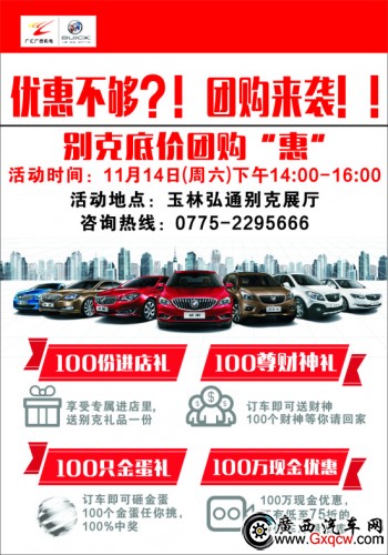 (特別說(shuō)明:本次別克廠家超級(jí)團(tuán)購(gòu)秒殺會(huì)由上海通用廠家舉辦,11月14日下午13:30集中本店簽到【玉林市教育東路31號(hào)玉林弘通別克4S店】,簽到有禮)