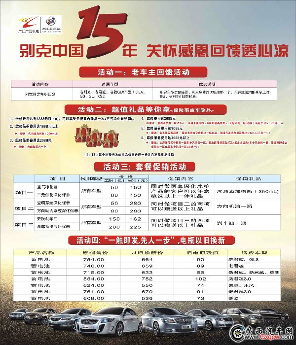 所有進站保養(yǎng)的老別克、老君威、老款GL8車型,可以免費贈送機油格一個,維修客戶均能享受工時8折,材料9折優(yōu)惠。