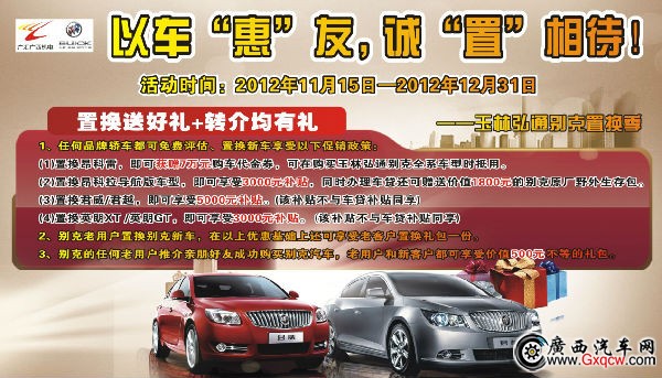 即日起至2012年12月31日,玉林弘通別克4S店以車“惠”友,誠“置”相待――別克置換季全面啟動(dòng),我們將有專業(yè)的二手車師評(píng)估師免費(fèi)為您的愛車鑒“寶”、估價(jià),同時(shí)為您量身定制二手車置換英朗、君威、君越、昂科拉、昂科雷等尊貴車型的方案;機(jī)會(huì)難逢,勿失良機(jī),專業(yè)的服務(wù)讓您省心到家。更多置換促銷方案如下: