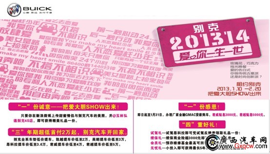 2013.1.4玉林弘通別克愛你一生一世"幸;顒蛹磳⑿履觊_假首日上演,您只需在1月4日-2月20日大聲發(fā)表愛情宣言親身定制愛情車牌把愛大膽SHOW出來!上傳情侶親密照片,即可獲贈精美車貼。