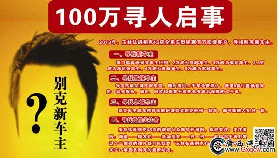 2013年3月起,玉林弘通別克4S店發(fā)出100萬尋人啟事公告,全系車型鉅惠百萬回饋尋找別克新車主,尊享玉林弘通別克比您更關(guān)心您的全方位服務(wù)。