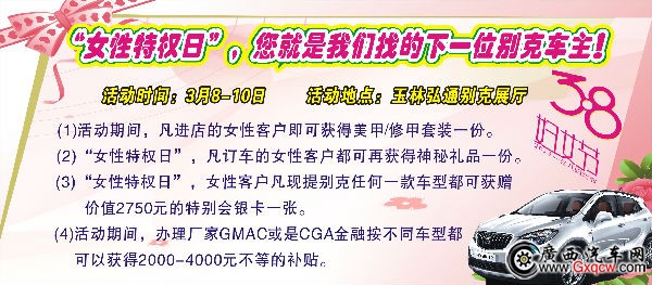 2013年3月8-10日,玉林弘通別克4S店將開(kāi)放“女性特權(quán)日”,活動(dòng)期間,女性客戶或是女性車主到店看車訂車購(gòu)車均有好禮相送,也許您就是我們要尋找那一位特別的別克車主,尊享我們的“女性特權(quán)日”。
