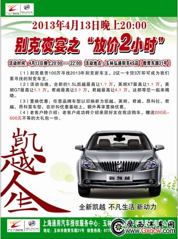 您還在苦等降價嗎?還在等待車展?還在徘徊猶豫嗎?還在持幣觀望嗎?NO!現(xiàn)在就給你一個**購車時機!2013年4月13日晚上20:00-22:00,別克夜宴之“放價2小時”鉅惠100萬回饋購車客戶,活動當晚到店即有禮品贈送,當晚定車即可參與抽獎,趕緊行動吧!詳詢:0775-2295666
