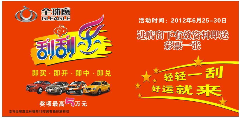 **鷹玉林穗邦4S店又有活動拉,凡進(jìn)店并留下有效資料的客戶即送彩票一張,*高獎金達(dá)5萬元,哈哈,好運在向您招手吶~活動時間為2012年6月25-30日。