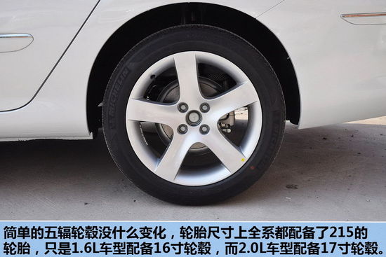 簡(jiǎn)單的五輻輪轂沒(méi)什么變化,輪胎尺寸上全系都配備了215的輪胎,只是1.6L車(chē)型配備16寸輪轂,而2.0L車(chē)型配備17寸輪轂。