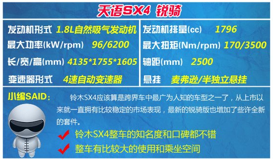 首先為大家推薦的這款,就是在國內跨界車市場中享譽已久的長安鈴木天語SX4,想必很多消費者對于跨界車的概念,還是源于天語SX4的出現吧。繼去年初長安鈴木推出了全新的天語尚悅三廂后,長安鈴木在去年底的廣州車展(微博)上也適時的推出了新款天語SX4銳騎兩廂車型。新車對車輛的外觀、內飾以及配置方面,均進行了升級和調整,廠家指導價為10.98-13.48萬元。