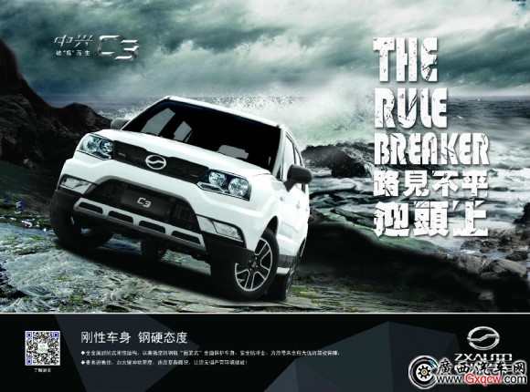 廣汽中興C3,是廣汽與中興合資公司生產(chǎn)的都市多功能SUV,楔形車身像極了路虎極光,硬朗時尚的外觀頗受廣大消費者的喜愛。搭載三菱4A91S發(fā)動機,1.5L的排量83KW功率113匹馬力縮短了其提速時間并保證了其強勁的動力。標配雙安全氣囊、車身多根防撞鋼梁及高強度鋼板給予駕乘人員“籠式”的安全保護,以保證駕乘人員的安全。4140*1761*1675的車身尺寸及2500的軸距保證了其超大的內(nèi)部空間以滿足消費者多種用途的需求。加上車輛配備的多種先進技術(shù)如大燈高度可調(diào)、BOS剎車優(yōu)先系統(tǒng)等,都讓其成為一部非常實用的多功能車,配上58800元起的價格,成就了廣汽中興C3名副其實的高性價比多功能SUV!