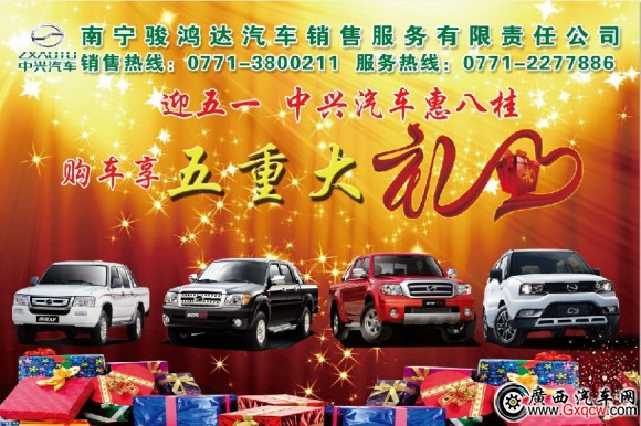 5月1日-5月3日,第二十三屆廣西汽車(chē)交易會(huì)暨安吉車(chē)展將在廣西汽車(chē)市場(chǎng)盛大舉行。南寧駿鴻達(dá)將攜中興汽車(chē)各款車(chē)型(旗艦A9、威虎G3、威虎T3)、廣汽中興C3商務(wù)版、導(dǎo)航版、至尊版亮相安吉車(chē)展,活動(dòng)期間購(gòu)中興汽車(chē)即享五重大禮:*高優(yōu)惠6000元;送2000元大禮包;更可獲贈(zèng)價(jià)值2000元的筆記本電腦/冰箱;購(gòu)車(chē)現(xiàn)場(chǎng)抽大獎(jiǎng);老帶新購(gòu)車(chē)更可獲雙重禮品!現(xiàn)場(chǎng)更有上車(chē)找錢(qián)和掃微信活動(dòng),歡迎廣大市民參與!