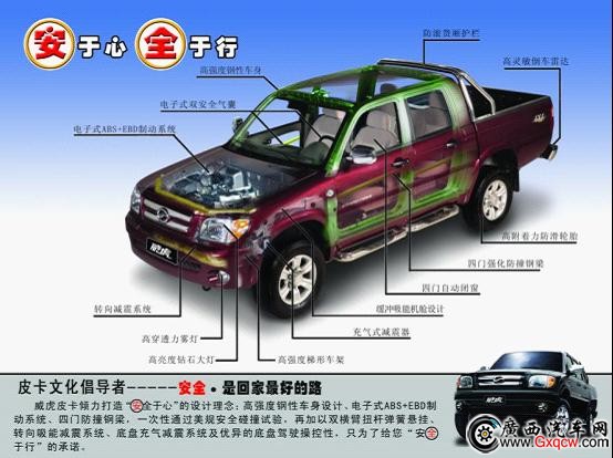 3、安全。威虎TUV標(biāo)配可吸能前保險(xiǎn)杠、四門防撞鋼梁,前機(jī)艙潰縮區(qū),加上貨廂突起的防滾杠,不管是出現(xiàn)碰撞還是翻滾都能很好的保護(hù)車內(nèi)的駕乘人員!威虎TUV也是**一輛一次性通過美規(guī)碰撞試驗(yàn)的國產(chǎn)皮卡。(注:氣囊版配前排雙安全氣囊)