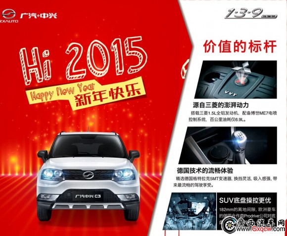 廣汽中興C3,是廣汽與中興合資公司生產(chǎn)的都市多功能SUV,楔形車身像極了路虎極光,硬朗時尚的外觀頗受廣大消費(fèi)者的喜愛。搭載三菱4A91S發(fā)動機(jī),1.5L的排量保證了其強(qiáng)勁的動力。標(biāo)配雙安全氣囊及車身多根防撞鋼梁保證了駕乘人員的安全。超大的內(nèi)部空間滿足了消費(fèi)者多種用途的需求。加上車輛配備的多種先進(jìn)技術(shù)都讓其成為一部性價比相當(dāng)高的多功能SUV!總結(jié)推薦的七大理由: