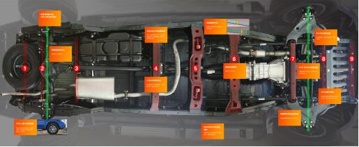 5、9根橫梁為威虎TUV專享,同級(jí)別皮卡一般為6根或以下,這造就了威虎TUV底盤的堅(jiān)固、承載更強(qiáng)、更加扎實(shí)。