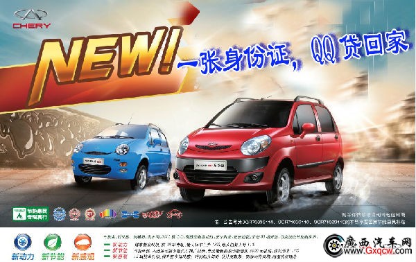 奇瑞QQ上市9年締造100萬(wàn)銷(xiāo)量神話,產(chǎn)品遠(yuǎn)銷(xiāo)**五大洲、近百個(gè)國(guó)家和地區(qū),2004年-2011年連續(xù)8年微轎銷(xiāo)量**,是名副其實(shí)的小車(chē)王。為了更好的服務(wù)于廣大車(chē)友,2012年8月份,奇瑞公司特推出“僅需一張身份證,奇瑞QQ輕松貸回家”的政策,奇瑞金融QQ個(gè)貸手續(xù)簡(jiǎn)化,僅需一張身份證即可辦理,個(gè)貸流程簡(jiǎn)化,一日審批,方便快捷。喜愛(ài)QQ的汽車(chē)朋友,此次金融貸款活動(dòng)可助你快助將QQ愛(ài)車(chē)貸回家。歡迎到柳州市鑫廣達(dá)奇瑞汽車(chē)4S店咨詢,或致電:0772-3217222