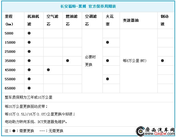 翼搏的整車(chē)質(zhì)保為三年或10萬(wàn)公里,廠家提供1次免費(fèi)保養(yǎng),保養(yǎng)間隔為10000公里。火花塞的更換周期為2萬(wàn)公里,相對(duì)比較短。燃油濾芯的更換周期為4萬(wàn)公里,空氣濾芯的更換周期為5萬(wàn)公里,手動(dòng)變速器油每8萬(wàn)公里更換。電動(dòng)助力轉(zhuǎn)向系統(tǒng)和DCT變速器是免維護(hù)的。