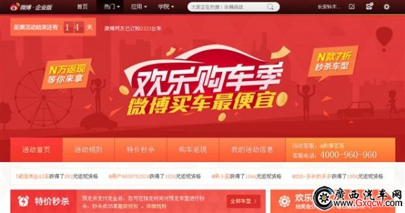 新浪歡樂購車季 1元換5000元!引爆金秋!2014年8月21日至9月3日,凡長安鈴木購車意向客戶,可通過電腦或手機登陸“新浪歡樂購車季”活動頁面http://huodong.weibo.com/auto/參與“購車返現(xiàn)”、“歡樂轉(zhuǎn)盤”等酣暢刺激的抽獎活動。讓你玩轉(zhuǎn)網(wǎng)絡(luò)的同時,享受非比尋常的購車驚喜:購車*高返還現(xiàn)金5000元,還有iPad mini等著你來搶!廣西恒晟多重購車鉅惠,為你開啟閃亮金秋。更多詳情歡迎免費咨詢:0771-3805199 3805897