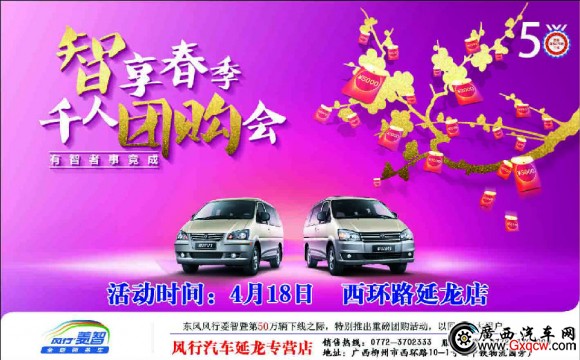 車展不參加,讓利給大家!東風風行菱智暨第50萬輛下線之際,特別推出重磅團購活動,以回饋廣大用戶。 風行汽車柳州西環(huán)路延龍專營店4月18日舉行有“智”者事競成團購會,F(xiàn)場除車價現(xiàn)金優(yōu)惠外,更有水果點心及眾多免費小禮品贈送,購車更有豪禮送不停。