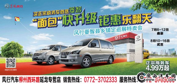 即日起,由東風(fēng)風(fēng)行柳州延龍專營(yíng)主辦、主題為“面包”狂升級(jí) 鉅惠樂翻天——風(fēng)行菱智縣鄉(xiāng)鎮(zhèn)定巡展特賣會(huì)大型系列巡展活動(dòng),在柳州各鄉(xiāng)鎮(zhèn)火熱開啟,本次活動(dòng)將為縣鄉(xiāng)鎮(zhèn)消費(fèi)者帶來超值的購車鉅惠,讓他們“足不出縣”就能購買到稱心如意的超值愛車。