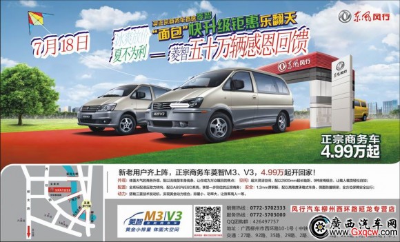 7月18日,由東風(fēng)風(fēng)行柳州延龍專營店舉辦的“冰爽放價,夏不為利—菱智五十萬輛感恩回饋”團購活動即將在柳州西環(huán)路延龍展廳處盛大開幕。有更多對菱智車型感興趣的消費者可以近距離體驗到菱智全系車型的全能商務(wù)魅力。