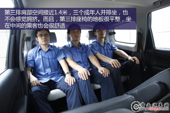 第三排座椅的寬綽有余,第三排肩部空間接近1.4米,三個成年人并排坐,也不會感覺擁擠。而且,第三排座椅的地板很平整,坐在中間的乘客也會很舒適。