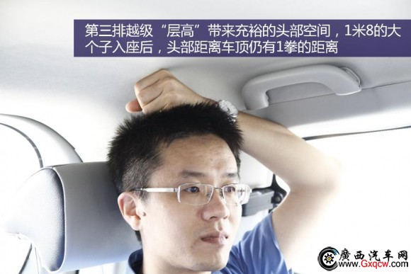 第三排越級“層高”帶來充裕的頭部空間,1米8的大個子入座后,頭部距離車頂仍有1拳的距離。