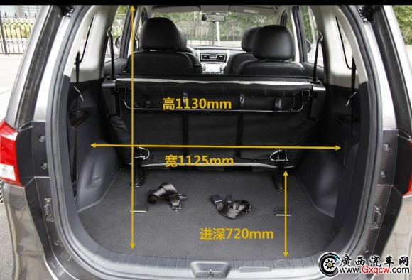 風行S500擁有*大寬度1230mm、高690mm、410mm底部進深和140mm上部進深的行李箱空間,童車折疊后可輕松置入。當將第三排座椅向前翻折時,用戶則可獲得寬1125mm、高1130mm和進深720mm的超大行李箱空間,外出休閑旅游物品幾乎可以一股腦全塞進去。同時,包括杯架、前后門板儲物格等在內的小型儲物空間,風行S500車內也多達13處,讓旅途更加便利,更加歡樂。