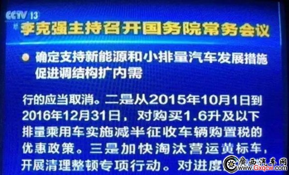 國務院會議決定:完善新能源汽車扶持政策,各地不得對新能源汽車實行限行、限購,已實行的應當取消。從2015年10月1日到2016年12月31日,對購買1.6升及以下排量乘用車實施減半征收車輛購置稅的優(yōu)惠政策。