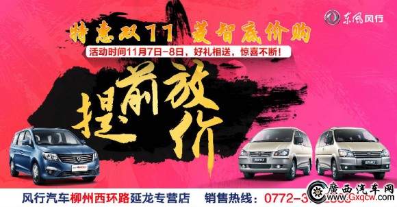 2016年11月7-8日 , 東風風行柳州西環(huán)路延龍專營店雙11提前開搶,錯開高峰抄底價,用最低的價格,享受*優(yōu)質(zhì)的服務,做精明的車主。