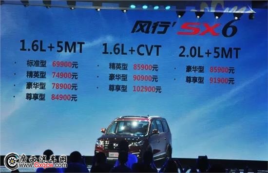 7月24日,SX6在北京上市,全車系分為三個動力總成,分別為:搭載三菱1.6L的CVT、三菱1.6L的MT和東風(fēng)風(fēng)行2.0L的MT三種動力總成。這幾款車型的售價區(qū)間為6.99萬元——10.29萬元,具體價格如下: