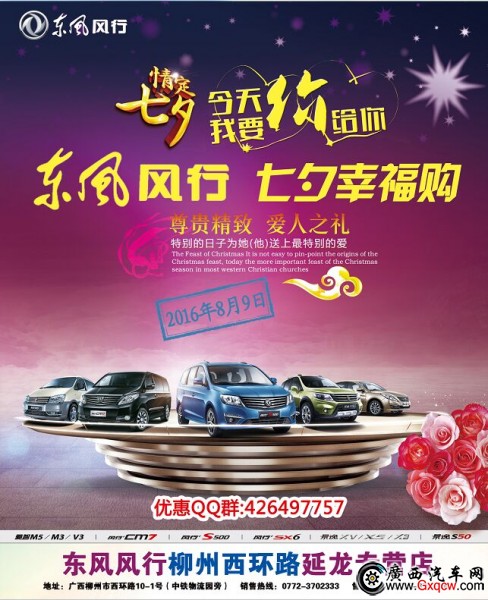 如果還表達(dá)不了你們的愛情,那就攜手東風(fēng)風(fēng)行柳州延龍專營(yíng)店,參與8月9日的“情定七夕 要價(jià)給你-東風(fēng)風(fēng)行七夕幸福購(gòu)”的專場(chǎng)活動(dòng)吧!